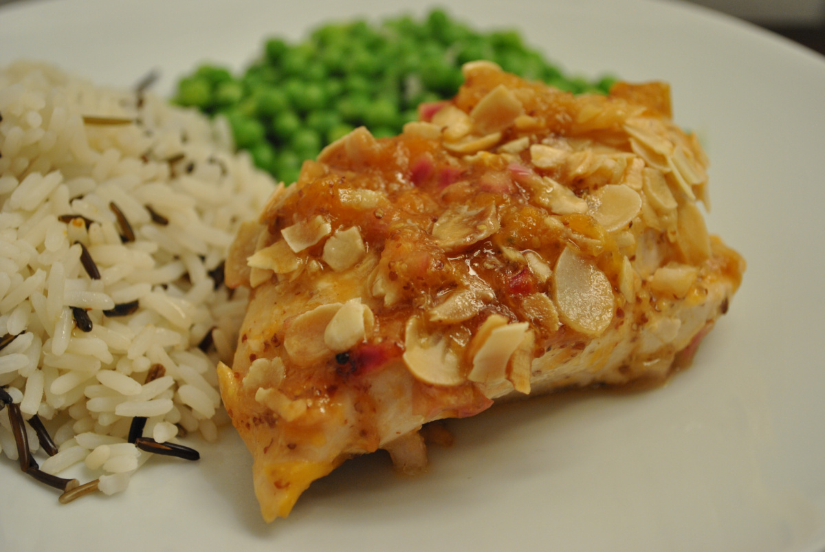 I adapted the recipe to suit my family’s tastes and I was very pleased with the results. I reduced the amount of vinegar in the sauce but increased the mustard. I also used more almonds than the recipe called for and changed the method slightly by baking the chicken in all of the sauce instead of reserving some of it to serve separately. I feel it helps keep the chicken extra moist.