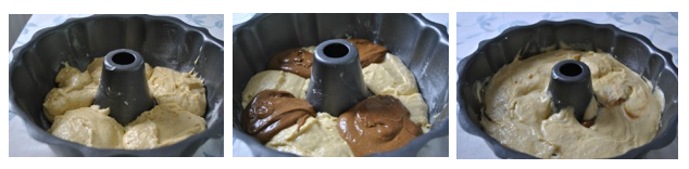 Put half the white batter in the bundt pan, then divide the coffee batter into three portions over top. Spread the remaining white batter over top carefully, smoothing the top a bit if possible.