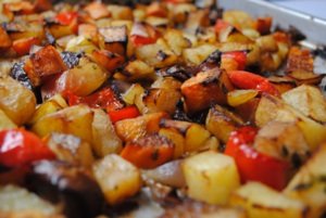 Sprinkle some salt over top of the roast vegetables to taste. Serve as a side dish with vegetarian sausages or nut roast, or divide between the plates and serve with fried or poached eggs on top.