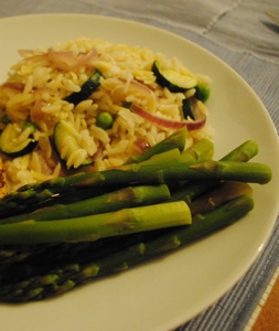Add the zucchini to the onion and continue to stir fry. If using frozen peas, add them with the zucchini, but if you have fresh, hold off a bit. Then, once the orzo is done and the zucchini is softening and going a bit golden, stir in the fresh peas and let them cook for just a couple of minutes until they are tender crisp. (If you were adding chick peas or almonds to make this a main course, now would be the time to do so.)