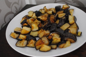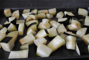 After marinating the chopped eggplant in olive oil and seasonings, you simply spread it on a baking sheet and roast it in a very hot oven – (375°F or 180°C) for about twenty minutes to half an hour.