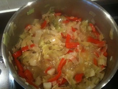 Melt the butter in a large saucepan over medium heat. Add the leeks and red pepper. Cook, stirring occasionally, until they look like this.