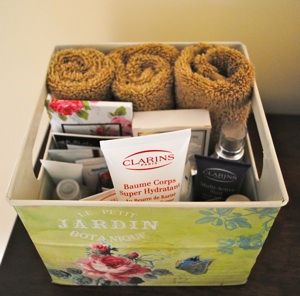 In this box, my guests will find two toothbrushes, toothpaste, a men’s disposable shaving kit, bubble bath, hair detangler, shower gel, face cleanser, men’s and women’s deodorant, body moisturiser, hand cream, face cleanser and sample moisturisers, among other things they might need. (I keep full size bottles of shampoo in the shower for guests to use, along with larger sizes of shower gel and of course, soap.)