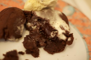 Like all of Nigella’s recipes, this one is easy to follow and if you do as she says, it will turn out beautifully. Do not, as I did with my first attempt, decide to cook these just a little longer than she says or you will end up with lots of cake and very little molten chocolate.