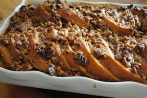 Take the casserole out of the refrigerator and make sure all the bread is well coated with the custard. Spread the Praline Topping over the top of the casserole.
