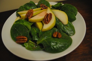 Slice the pears in quarters (do not peel) and remove the stem and seeds. Slice each of the quarters in three to four long pieces. Place them in a salad bowl with the spinach and the pecans and toss together. Drizzle the dressing over the top and then gently toss the salad. Serve immediately.