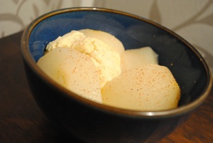 I had, however, never poached pears myself. I have poached eggs before and my family loves poached chicken and poached salmon, but never pears. But the arrival of nearly a dozen ripe pears in my organic fruit and vegetable boxes last week made me decide I had to try. You see these pears had somehow gotten terrible bruises all over their skin – but peeling one revealed that was as far as the bruising had gone. They were delicious – ripe, juicy gorgeousness. However the way their skin was looking there was absolutely no way that was going to last. If I wanted to enjoy those pears, I was going to have to do something, and quickly. So I turned to an expert. David Lebovitz wrote a fantastic post on poaching pears back in April 2009, a post that is a delight to read as well as providing well written, easy to understand instructions, with variations.