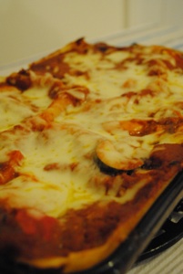 Heat the oil in a large saucepan and gently sauté the onion until it begins to soften. Stir in the tomato sauce and pesto and heat through. Add the oregano and roast vegetables and simmer over low heat for ten minutes or so, stirring occasionally. Taste the mixture and add salt and pepper to taste if necessary.