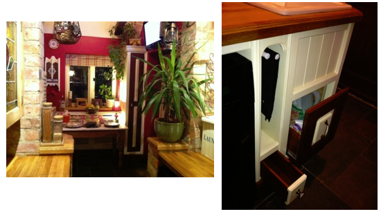 They needed to include an area for the washer and dryer as there is no separate utility room. So they used this area by the back entrance and used lovely glass doors on the cupboard storage panels, creating storage that is functional as well as beautiful.