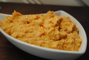 Heat a tablespoon of the olive oil in a frying pan over medium heat, and sauté the onions and peppers until they are soft. Tip into a blender. Add the remaining olive oil, paprika, coriander and cumin. Grate in the garlic cloves and add the lemon juice and zest as well as the sweet chili sauce. Blitz until smooth.