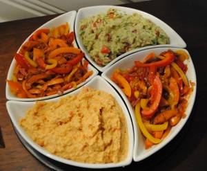 It’s super easy to find vegetarian options for appetizer trays. Vegetables and beans lend themselves beautifully to this kind of thing. Two of my favourite appetizers are Red Pepper Crostini (which I also make using assorted colours of peppers) and Braised Pea, Broad Bean and Artichoke Dip. I like to include a nice Guacamole and some Humous, a Middle Eastern food made from chickpeas (also known as garbanzo beans).