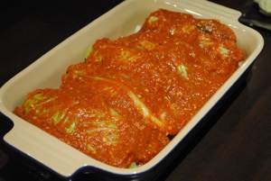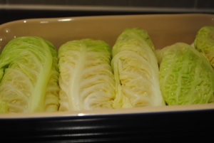 Now, to assemble the cabbage rolls. Place a cabbage leaf on a bread board, and spoon about 2 tablespoons of the filling mixture into the centre. Wrap the edges of the cabbage leaf round the filling and form into a roll. Place seam side down in a casserole dish. Repeat until you have used all the cabbage leaves. Be sure to tuck the cabbage rolls snugly in the casseroles. They should look something like this.