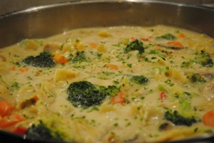 Yesterday I found myself with a fridge full of gorgeous vegetables but very few ideas about what to cook for dinner, so I decided to make an old standby – ‘Pasta Thing’ or my Vegetarian Pasta One Pot. I just start with whatever is in the fridge plus a bit of dried pasta and see what evolves. It’s usually a pretty successful undertaking, and this time was no exception. It was so easy and cleanup was a breeze because I cooked the pasta in the sauce all in one pan. Dinner was on the table in only a little over half an hour, and everyone enjoyed it so much that there were intense negotiations about who got to eat the leftovers for lunch today!