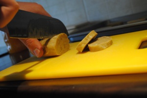 Take a large piece of waxed or greaseproof paper or baking parchment and sprinkle a little flour on it. Flour your hands a bit as well. Take half the cookie dough and put it in the centre of the paper. Using the paper to help you, shape the dough into a log about 11 to 12 inches (28 to 30 centimetres) long. Repeat with another piece of paper and the rest of the dough