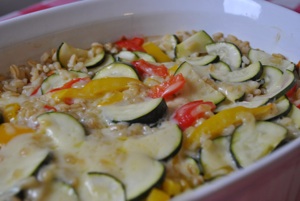 Mix the Ebly, vegetable stock, basil, pepper, and the vegetables together thoroughly in a large casserole. Spread the mixture evenly in the casserole. Sprinkle with the cheese.